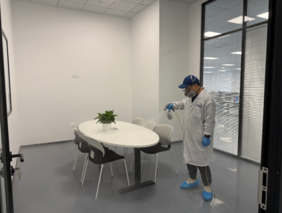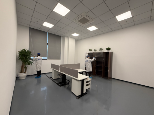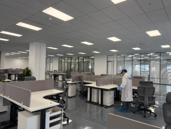 杭州紐鼐機器人有限公司深耕通用設備制造與機器人研發領域,其 1600㎡辦公空間坐落于杭州蕭山區經濟技術開發區,涵蓋開放式研發區、獨立辦公室、會議室、設備陳列區、員工休息區等多個功能區域。因辦公空間新裝修完成,全屋采用大量辦公定制柜體、隔斷板材、墻面涂料、地毯軟裝,加之設備陳列區柜體密集、部分研發區域通風條件有限,形成了甲醛、TVOC 等多元有害氣體污染源;同時作為科創研發企業,辦公區各類精密儀器、研發設備密集,對除醛治理的安全性、無腐蝕性、高效性提出嚴苛要求,既要實現深層除醛,又要確保治理過程不損傷精密設備,保障企業后續研發工作順利開展。企業在參考杭州除甲醛品牌排名、對比多家杭州除甲醛公司后,認準創綠家的工裝治理經驗與科創空間服務案例,最終選定創綠家為本次 1600㎡辦公空間的專屬除醛服務商。